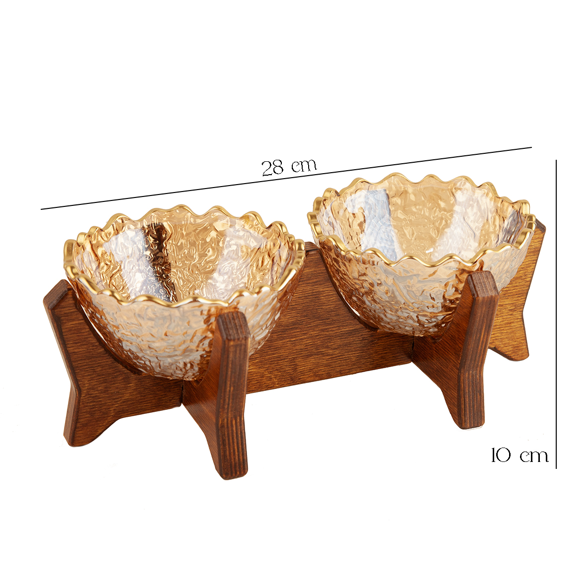 دو کاسهی بلوری روی پایهای از چوب طبیعی پلایوود قرار گرفتهاند که علاوه بر استحکام، گرمایی طبیعی و دلپذیر به طراحی سرد و درخشان بلور میافزاید. تضاد متعادل بین چوب و بلور، باعث شده این اردوخوری هم مدرن و لوکس باشد و هم حس آرامش و طبیعت را به فضا منتقل کند.