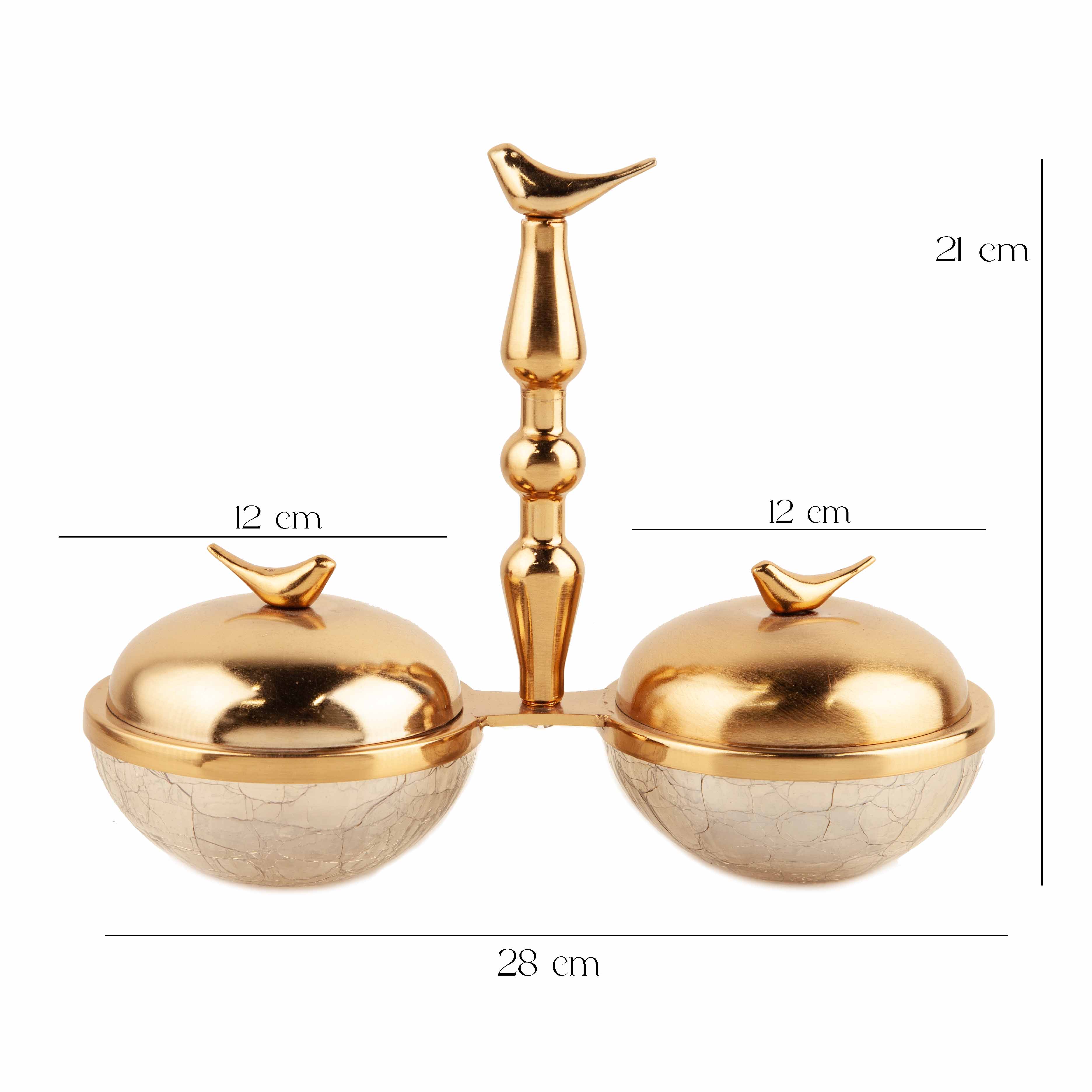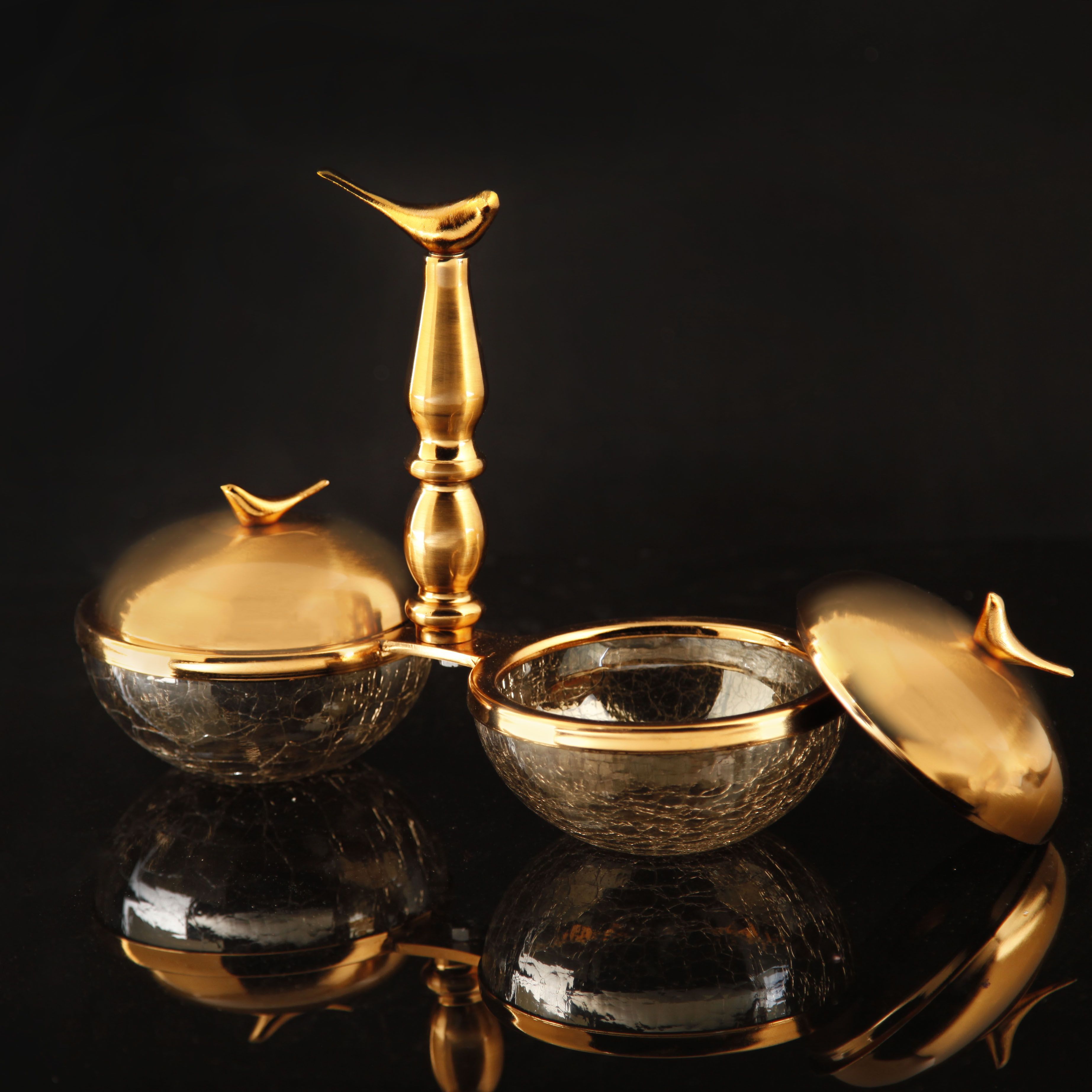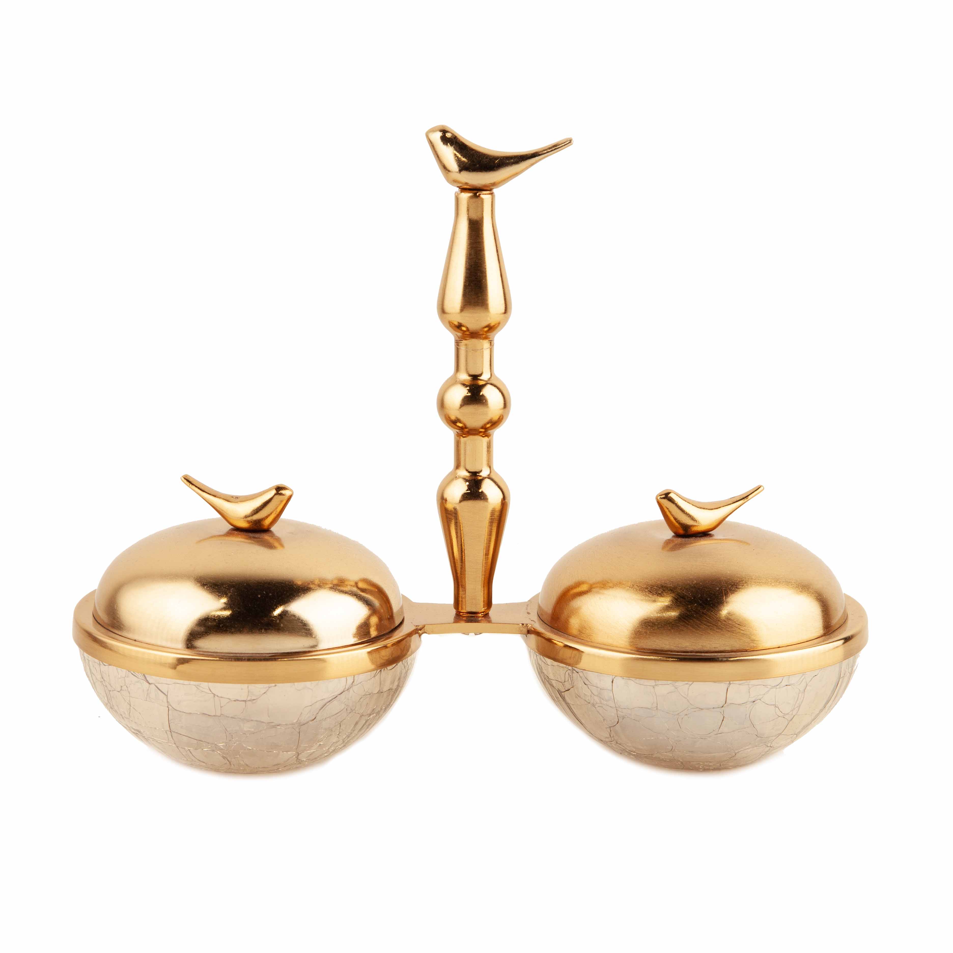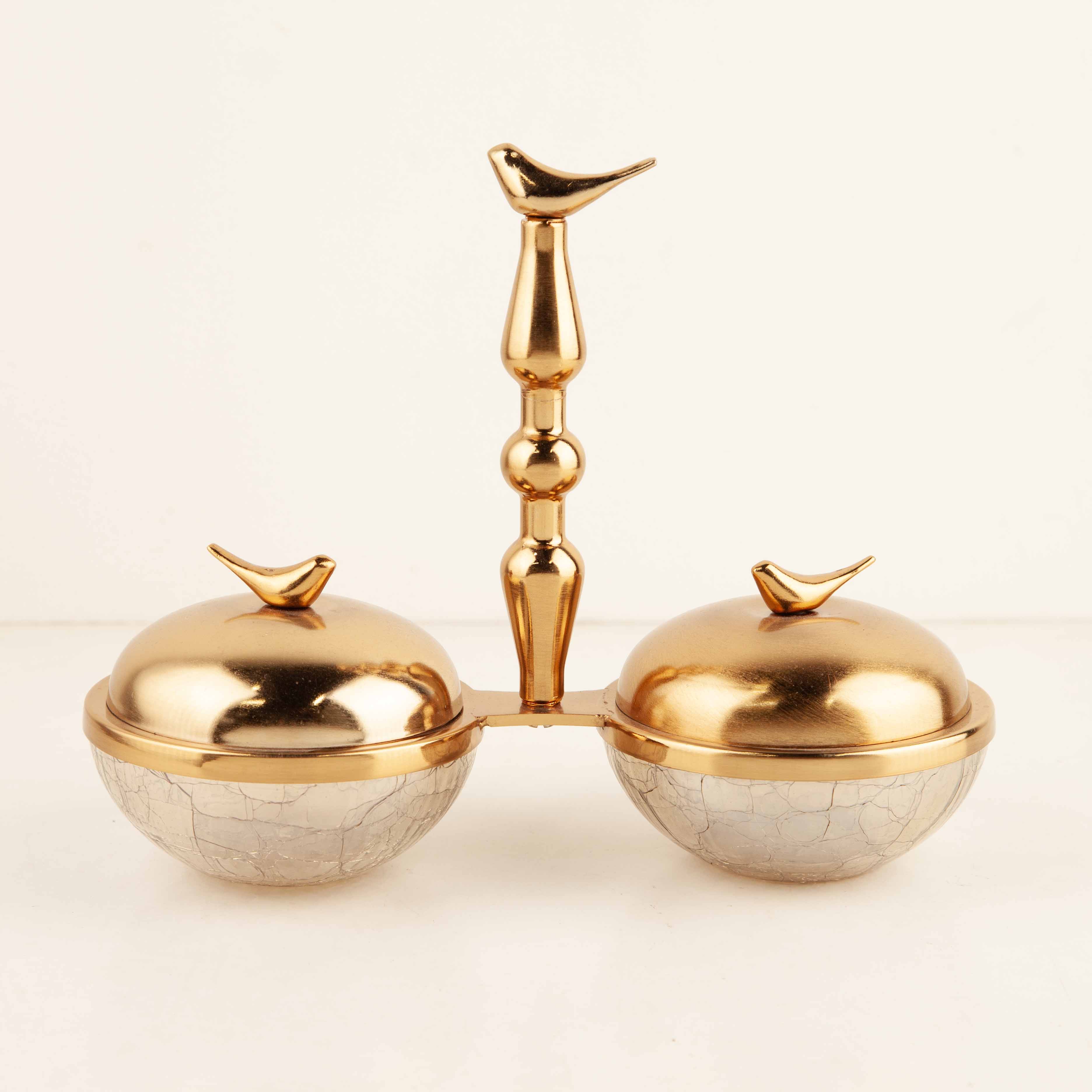 اردو آبگز دوتایی مرغان عاشق، ساخته‌شده از شیشه مقاوم با پایه فلزی آبکاری فورتیک، مناسب برای سرو مزه، ترشی و دسر با طراحی هنرمندانه و خاص.