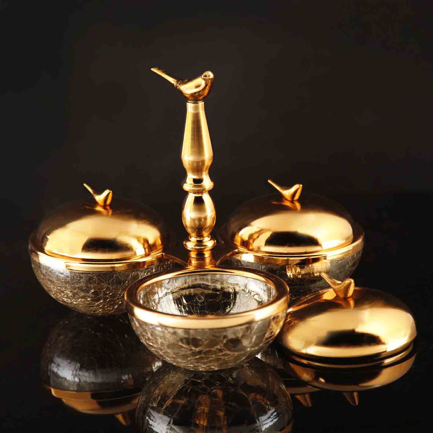 اردو آبگز سهتایی مرغان عاشق، یک ظرف پذیرایی خاص و هنری است که با الهام از زیبایی و صمیمیت فرم مرغان عاشق طراحی شده است. این محصول از سه ظرف شیشهای شفاف باکیفیت تشکیل شده که روی پایهای از فلز با آبکاری فورتیک قرار گرفتهاند.