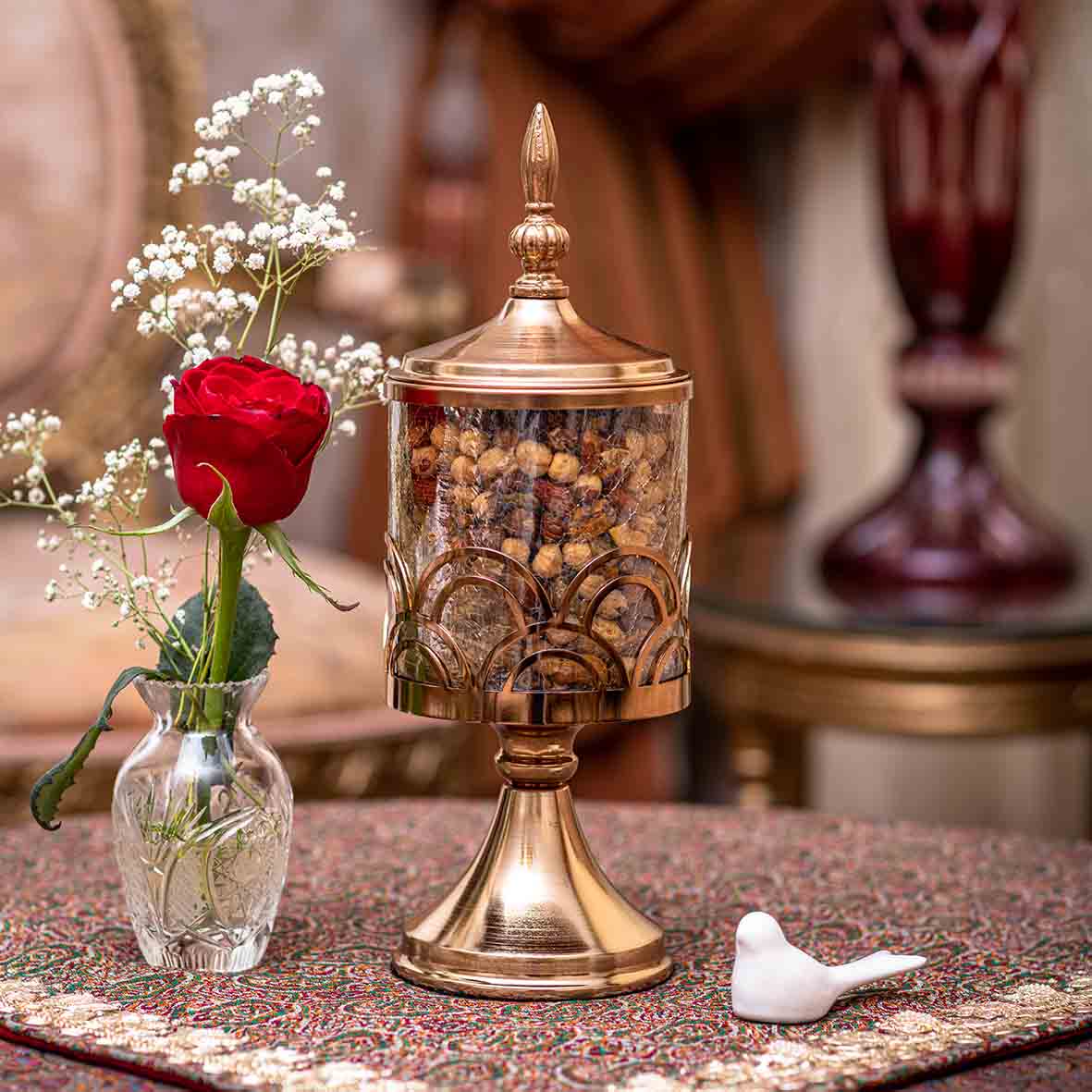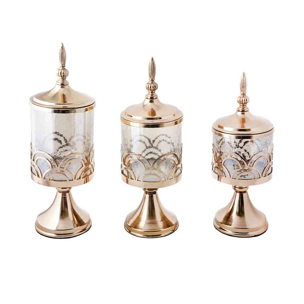 بانکه پایهدار طرح پردهای، با بدنهای از شیشه آبگز و پایه و درب فلزی فورتیک، یک انتخاب لوکس برای نگهداری قند، آجیل یا دکور آشپزخانه است.