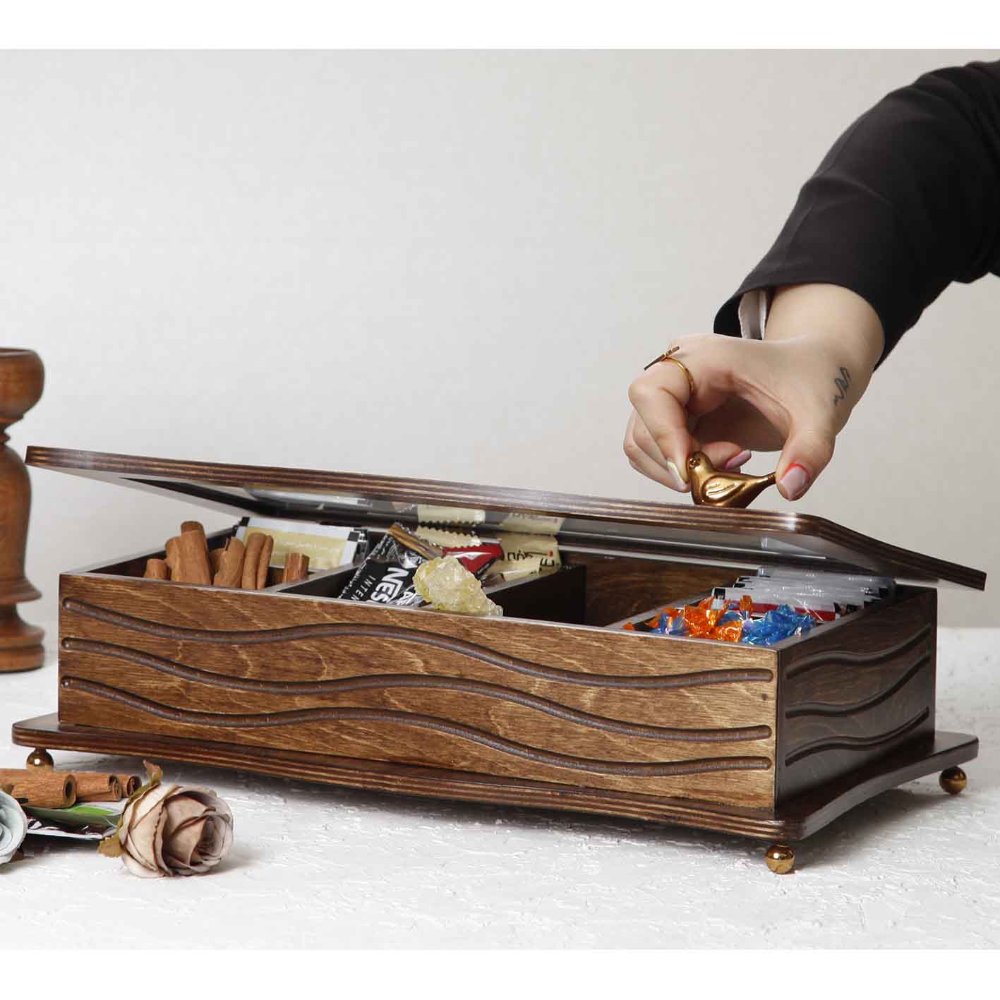 تیباکس ششخانه باران ترکیبی از نظم، ظرافت و هنر ساخت دقیق است. این جعبه از چوب پلایوود مرغوب ساخته شده و دارای شش خانهی مجزا است که برای نگهداری و تفکیک انواع چای، دمنوش یا حتی قهوه طراحی شدهاند.
