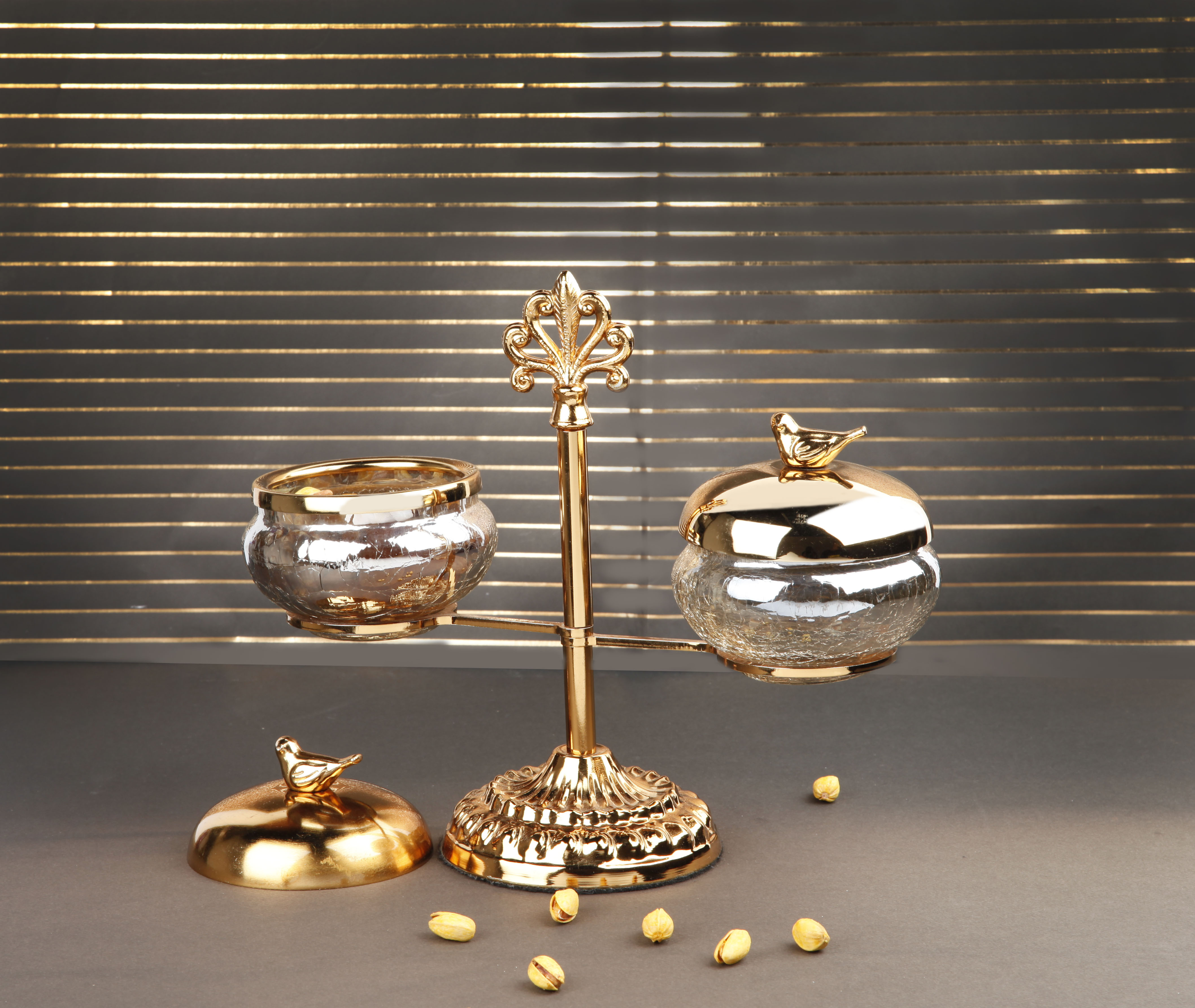 اردو پیاله دوتایی با طراحی همسطح و پوشش برنز براق، مناسب برای سرو تنقلات، مزه و چاشنی. ساختهشده از متریال مقاوم و بادوام با طراحی مدرن