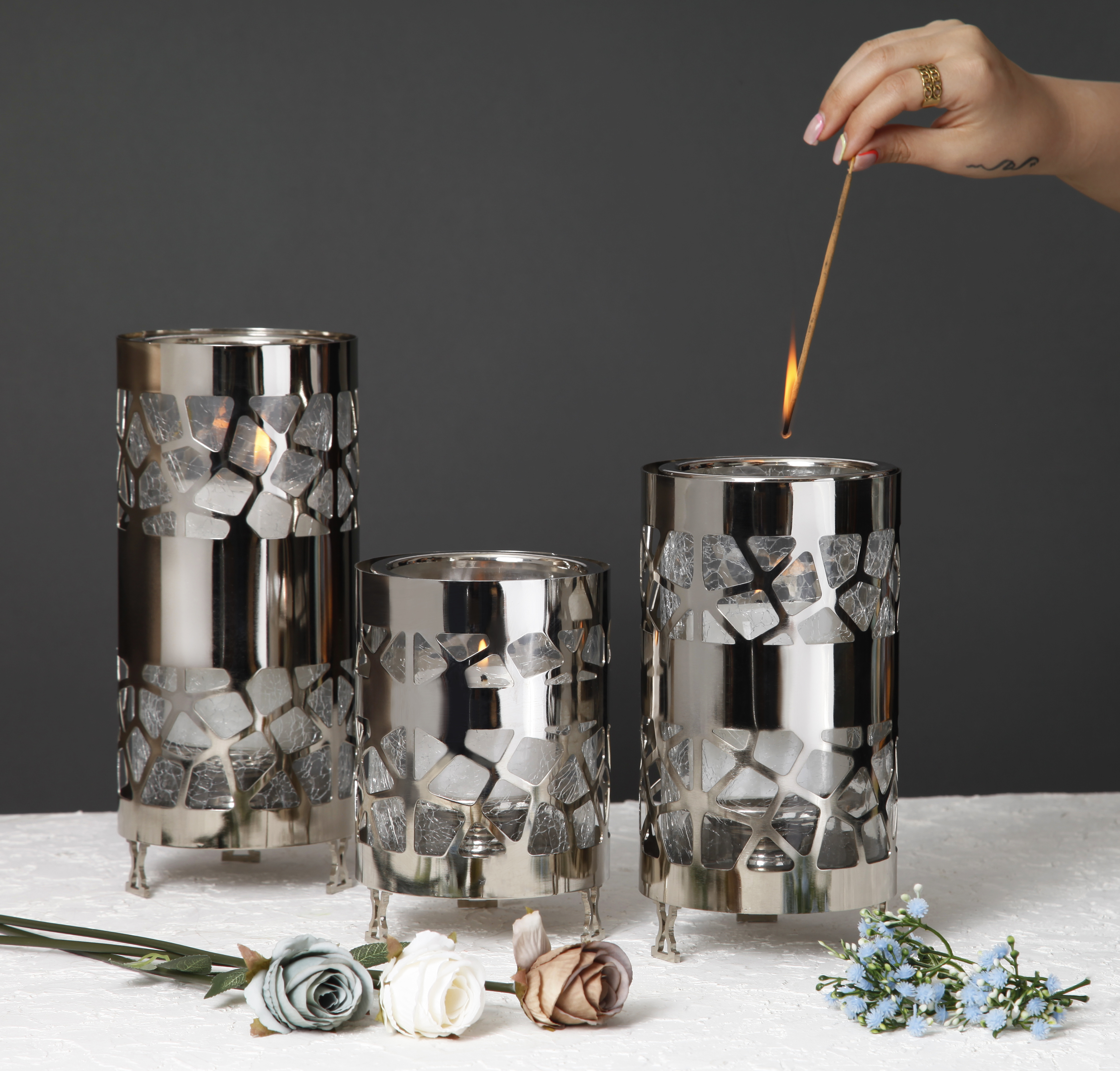 شمعدان فلزی با طرح سنگی و رنگ سیلور، مناسب برای دکوراسیون مدرن و شیک، جلوهای خاص به فضای شما میبخشد.