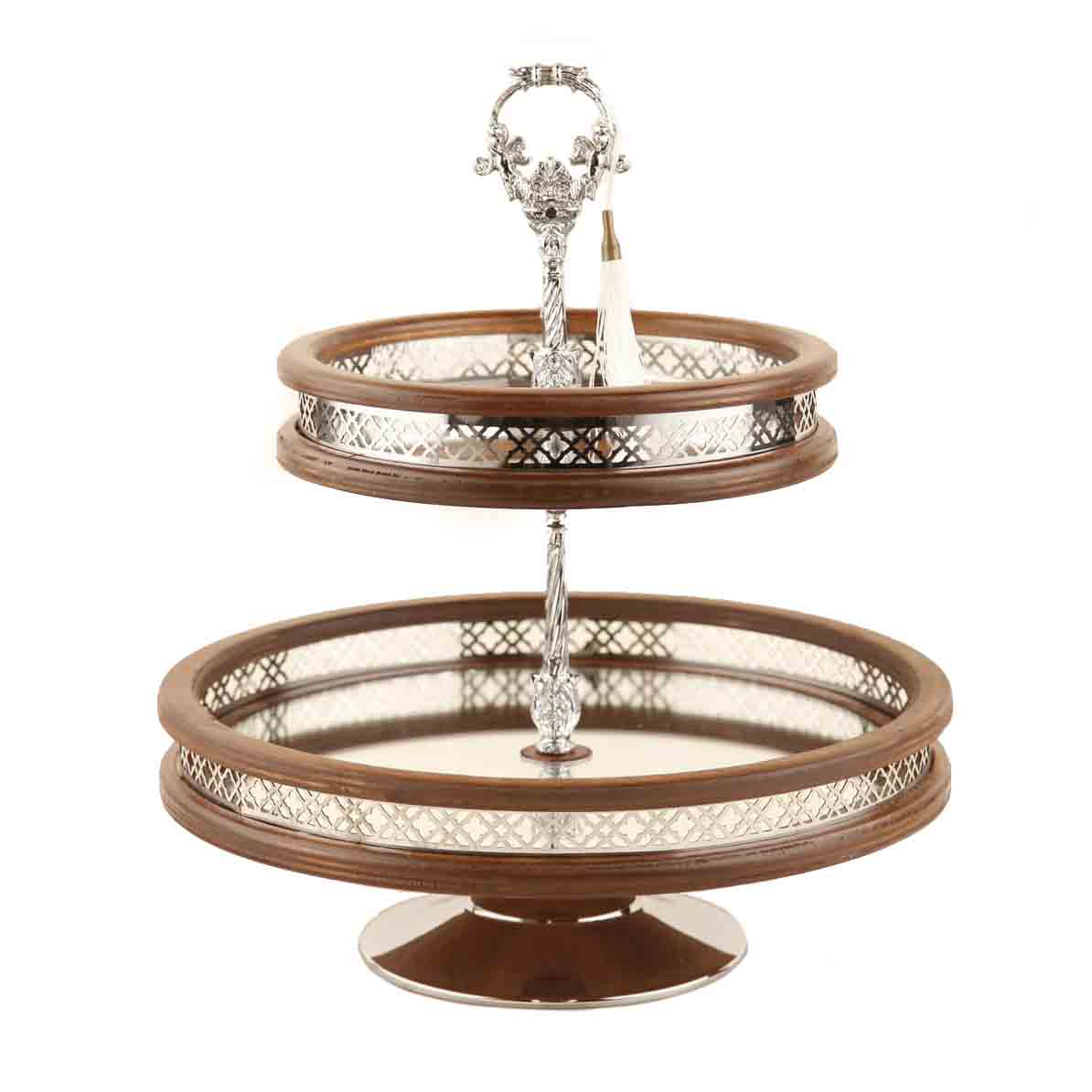 شیرینیخوری دو طبقه تابان سیلور با طراحی مدرن و شیک، از چوب پلایوود با پایههای فلزی آبکاریشده سیلور ساخته شده است. این شیرینیخوری لوکس برای پذیرایی در مهمانیها و مجالس رسمی انتخابی ایدهآل بوده و جلوهای خاص به میز شما میدهد.
