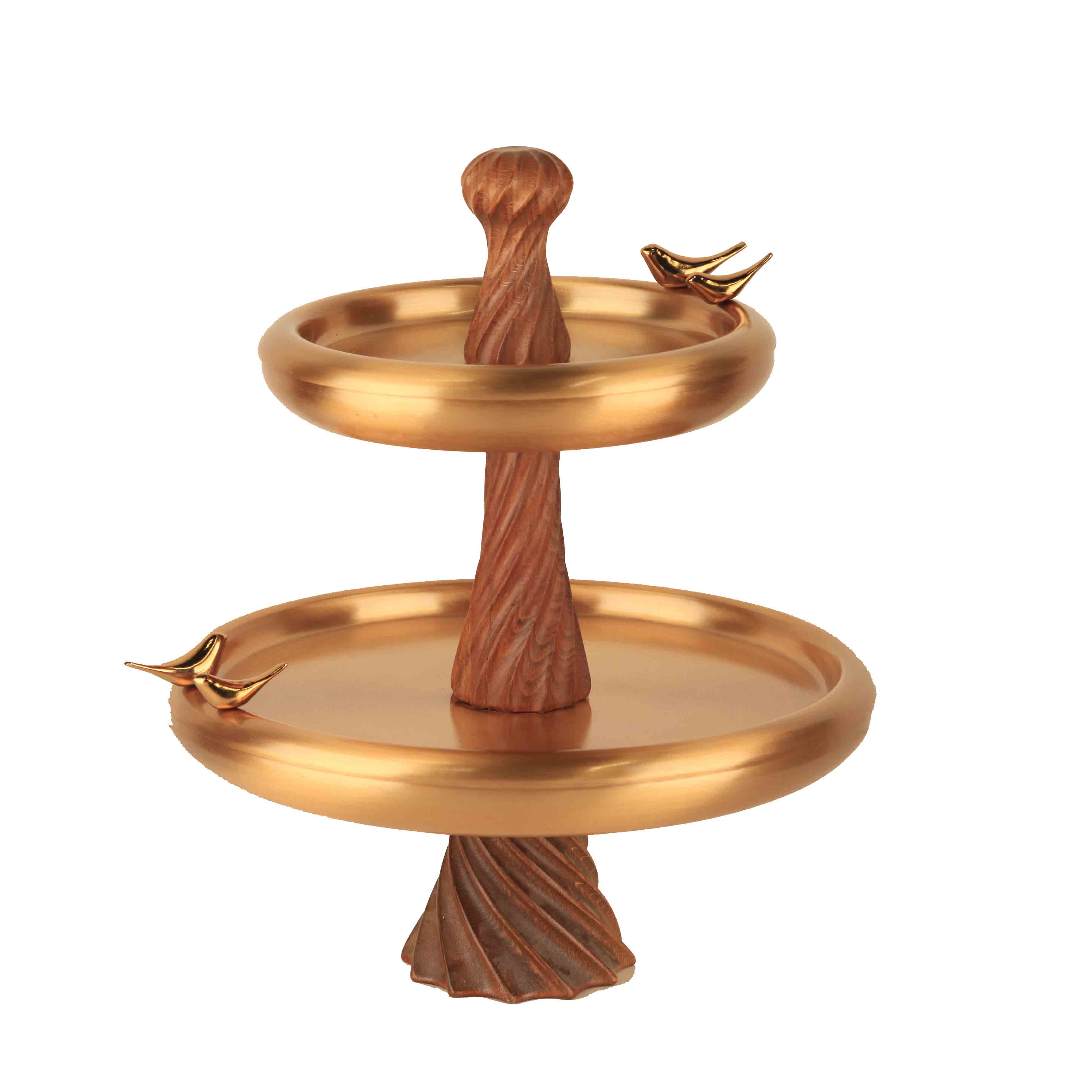 شیرینیخوری دو طبقه رامونا یک انتخاب خاص و ماندگار برای پذیراییهای رسمی و روزمره است. بدنه و سینیهای این محصول از آلومینیوم باکیفیت ساخته شده که با آبکاری فورتیک طلایی پوشانده شده است. این نوع آبکاری علاوه بر زیبایی و درخشندگی، مقاومت بسیار بالایی در برابر خطوخش، تغییر رنگ و شستوشو دارد.