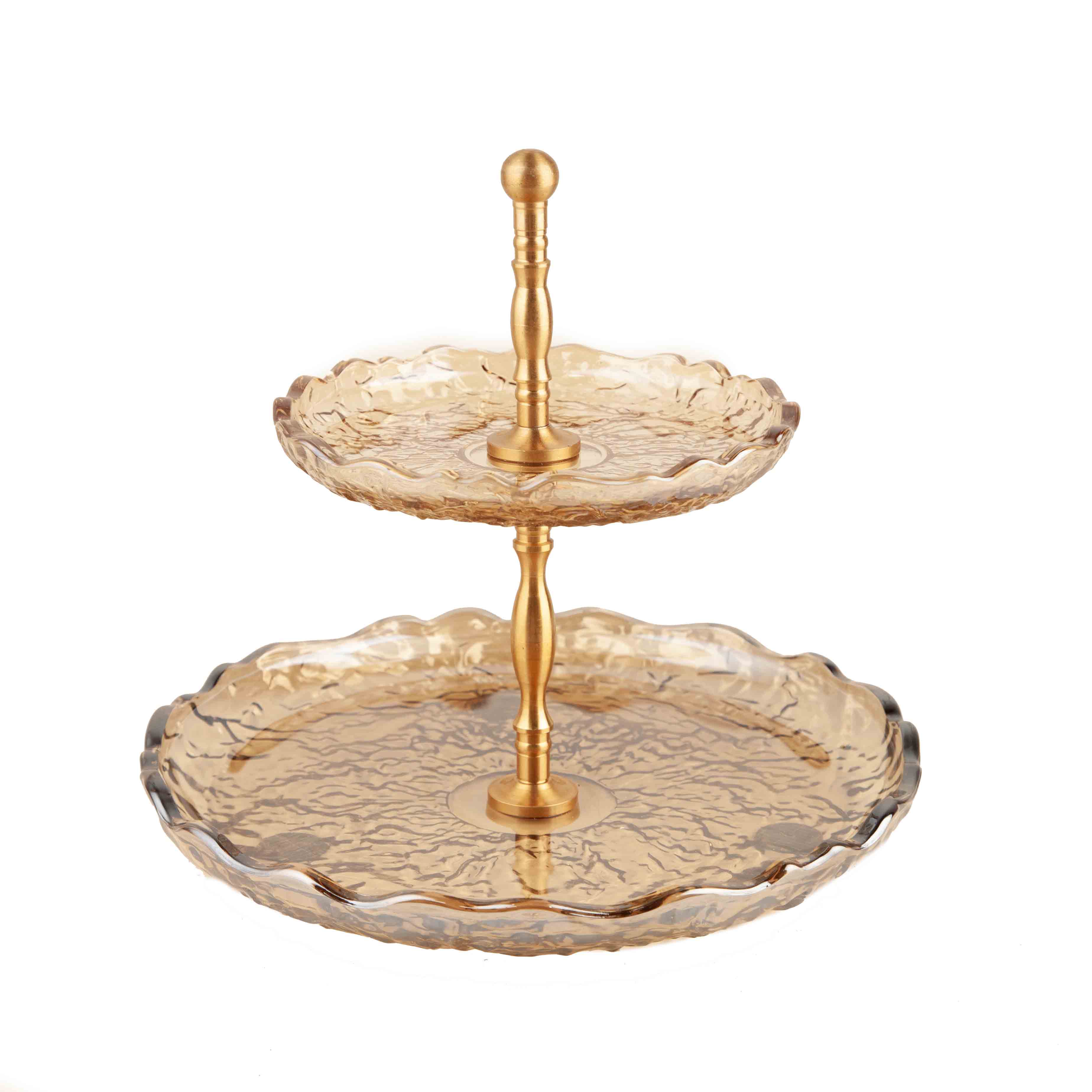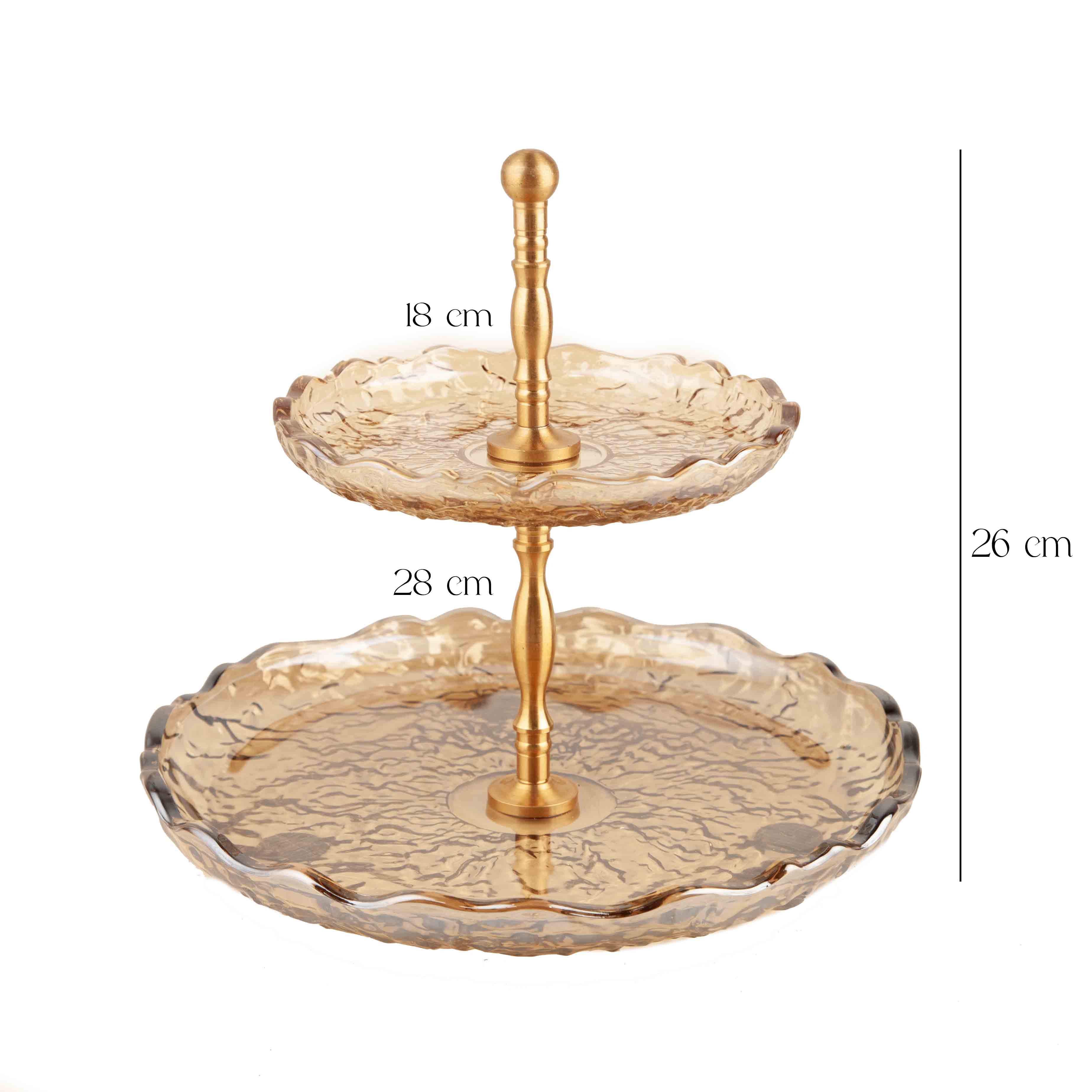 شیرینیخوری دو طبقه لاوین، ساختهشده از بلور طرح یخی رنگ عسلی با دسته آلومینیومی و آبکاری فورتیک، مقاوم در برابر تغییر رنگ و زنگزدگی.