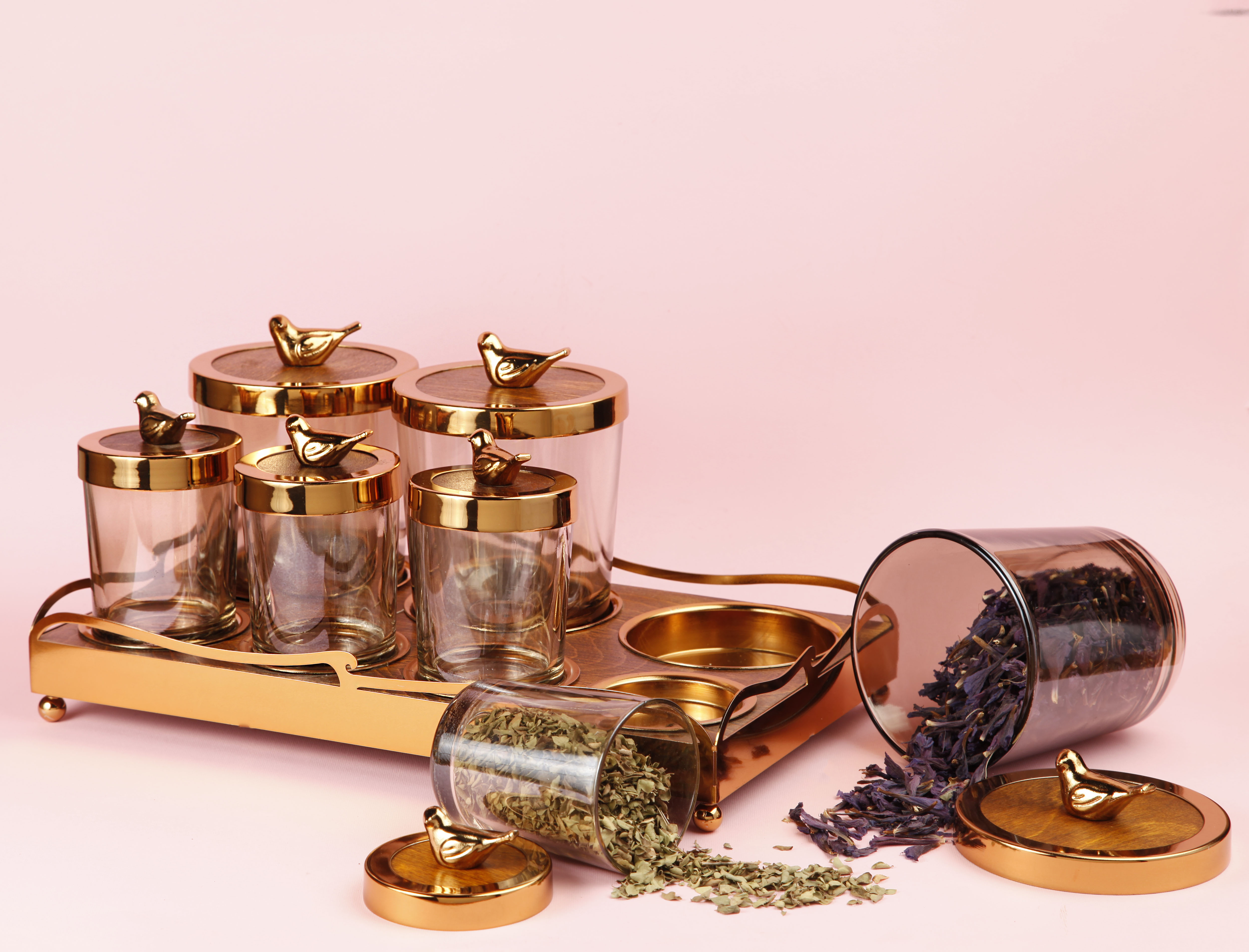 ترکیب چوب راش، بلور شفاف و فلز طلایی باعث میشود این ست علاوه بر کاربردی بودن، به عنوان یک اکسسوری دکوراتیو شیک نیز در آشپزخانه بدرخشد.