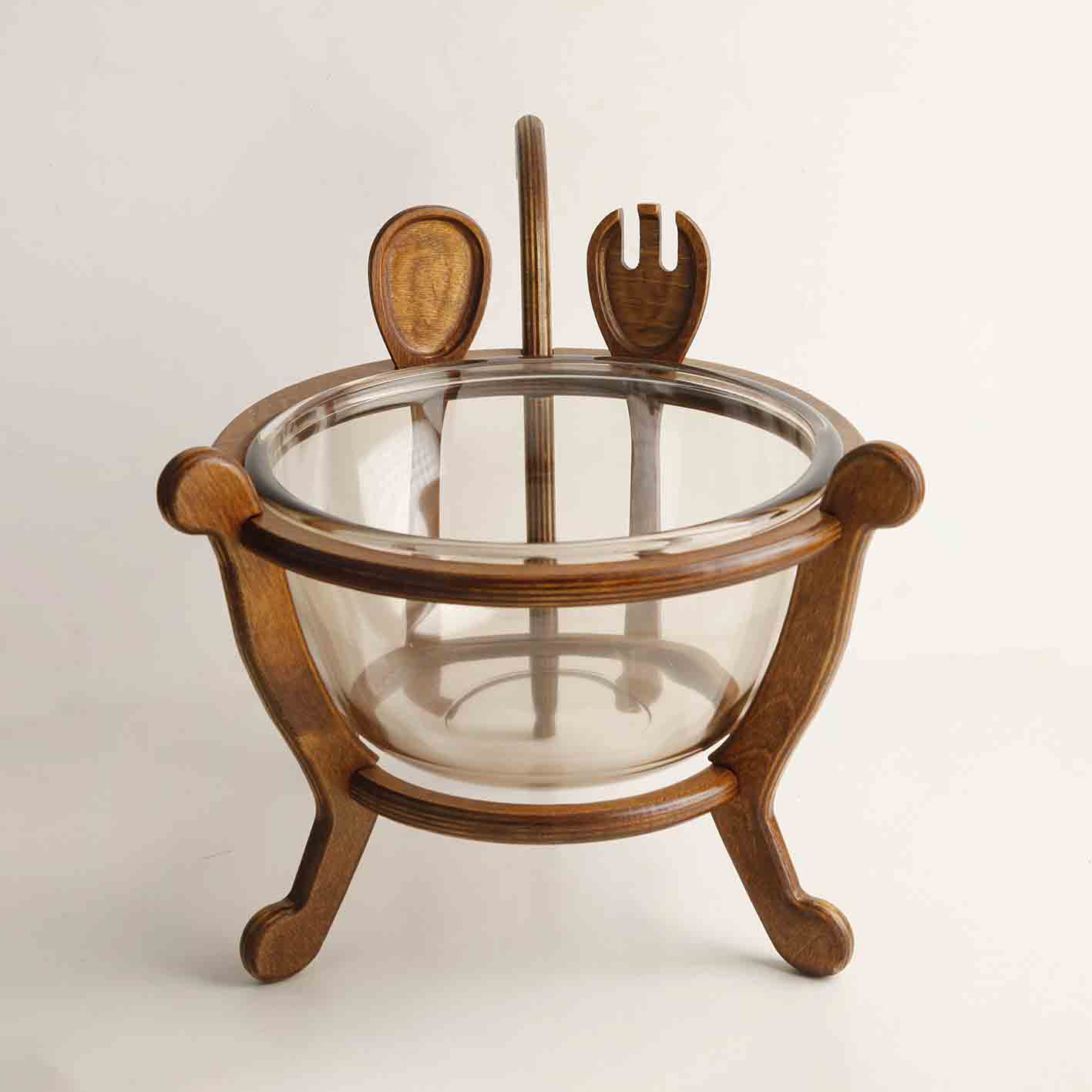 سالادخوری دستهدار با ظرف بلوری شفاف و پایه چوبی از جنس پلایوود؛ ترکیبی از زیبایی، دوام و طراحی مدرن برای سرو حرفهای و شیک.