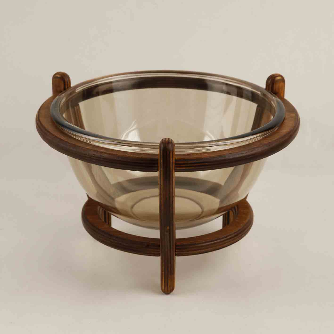 سالادخوری سهپایه با ظرف بلوری شفاف و پایههای چوبی از جنس پلایوود؛ ترکیبی از شفافیت، گرما و طراحی مدرن.