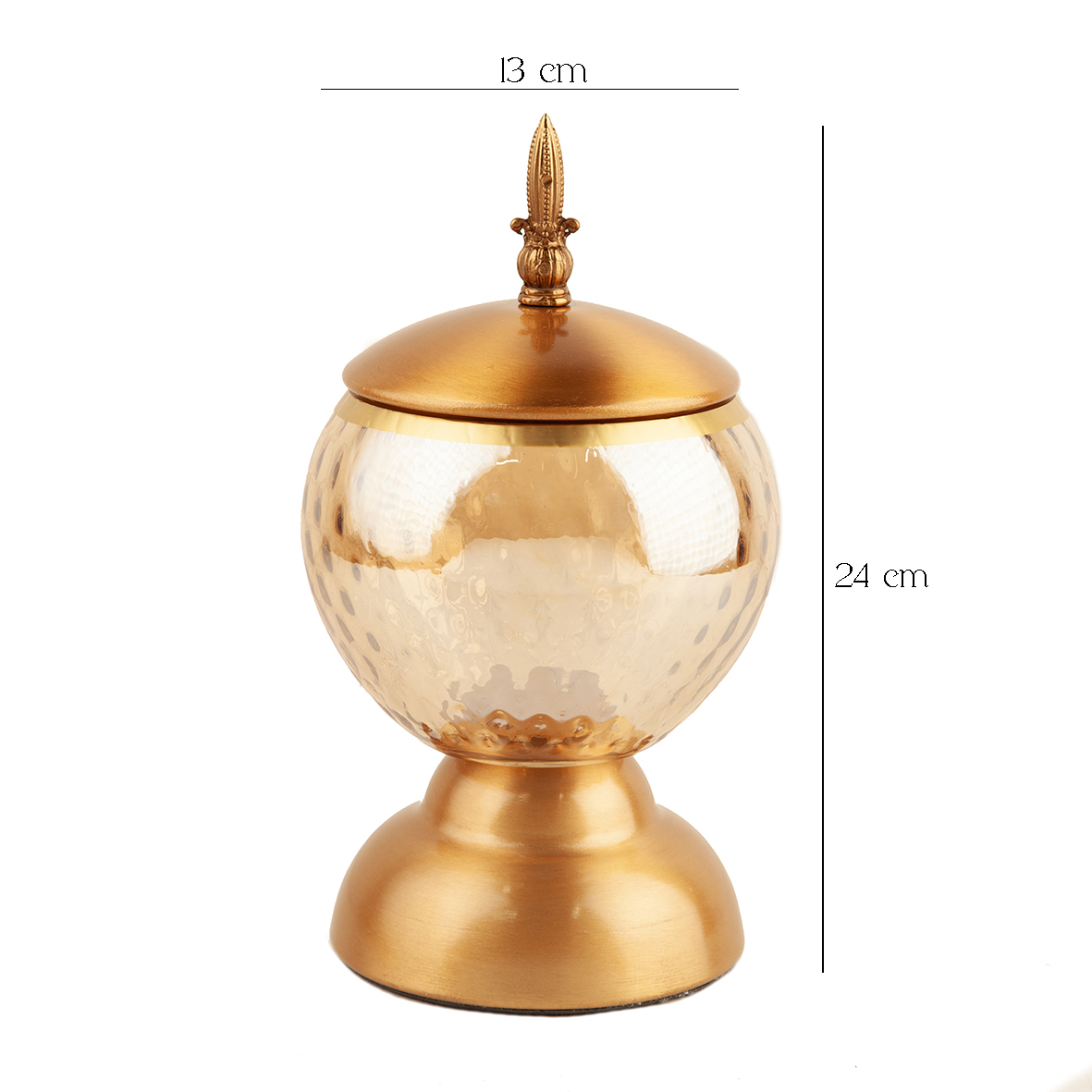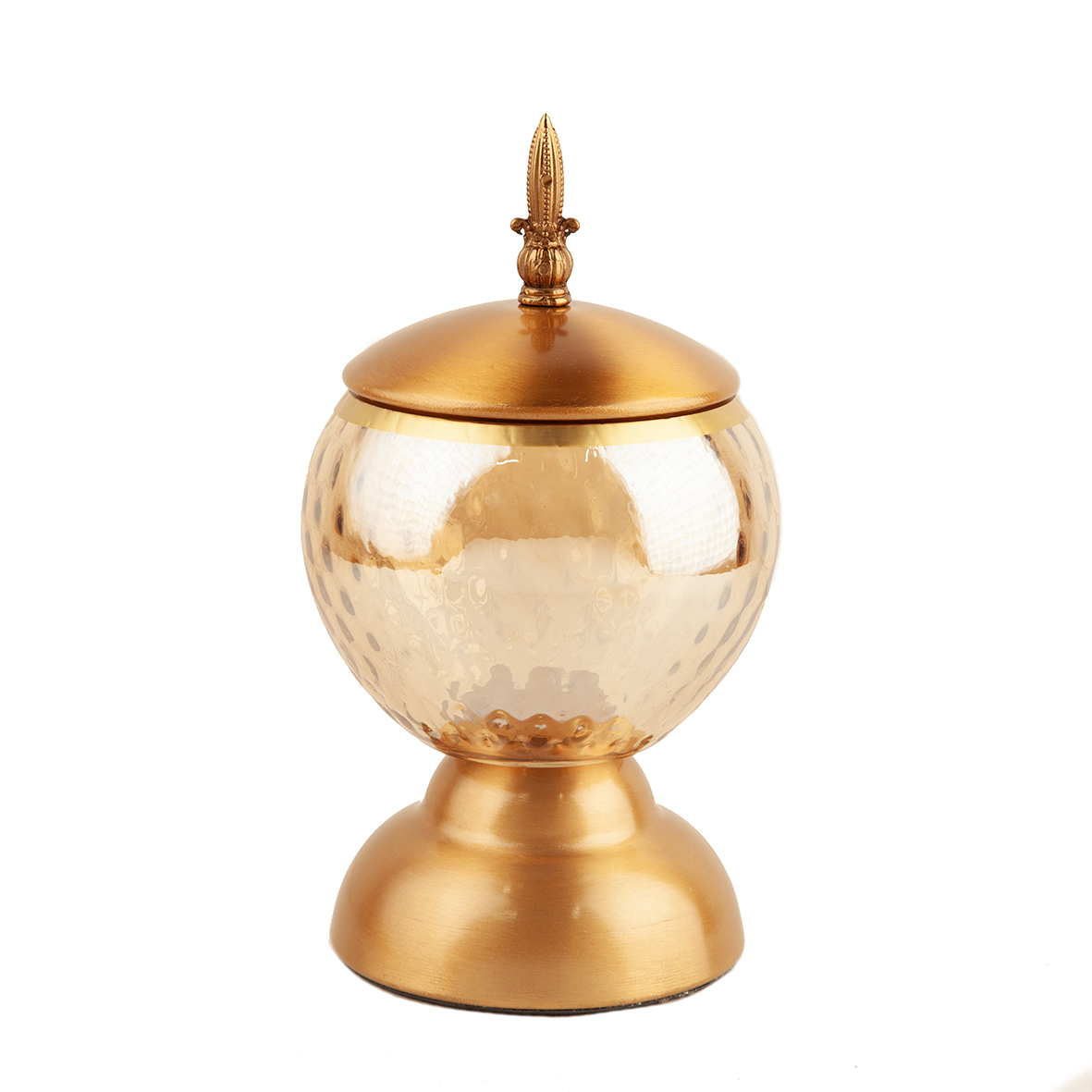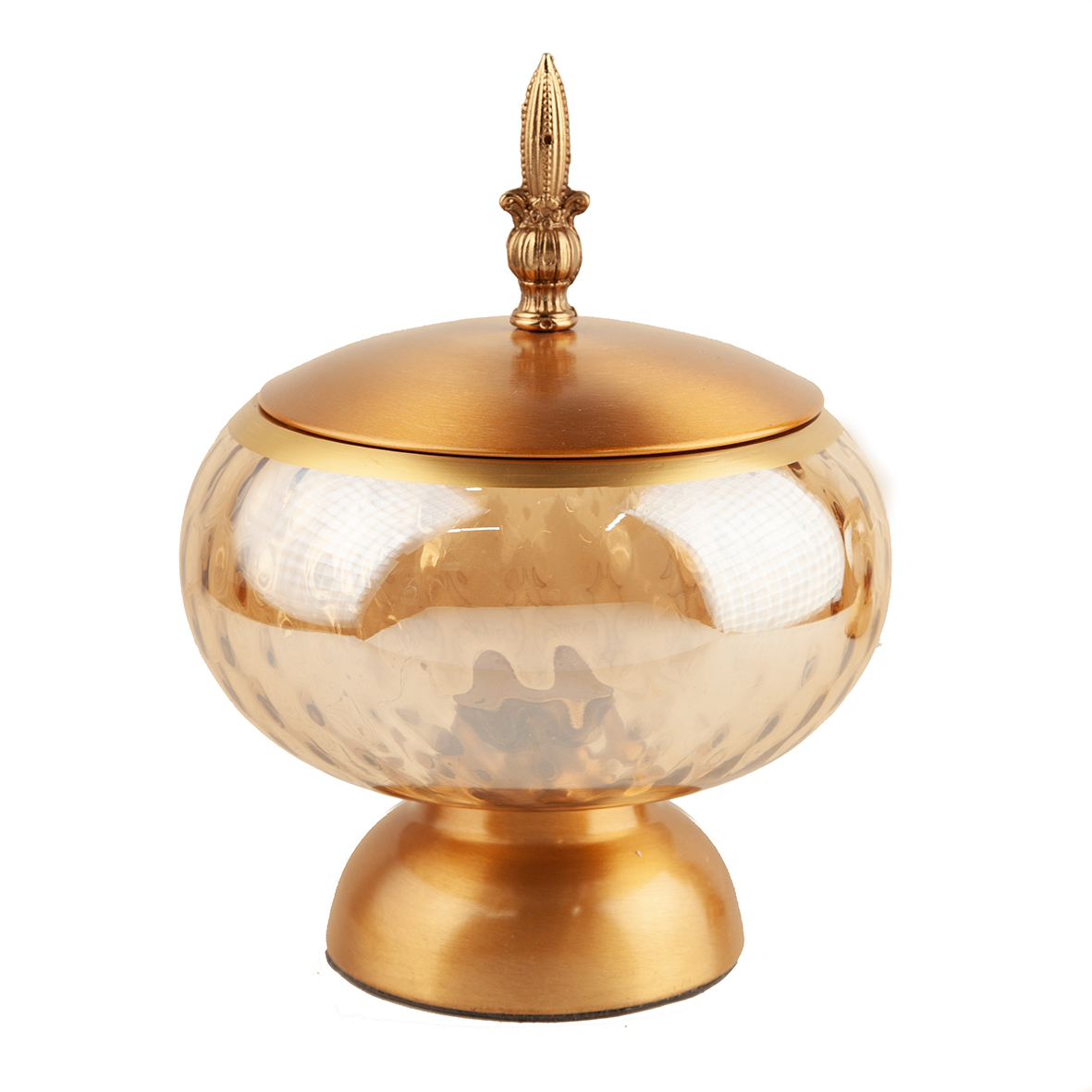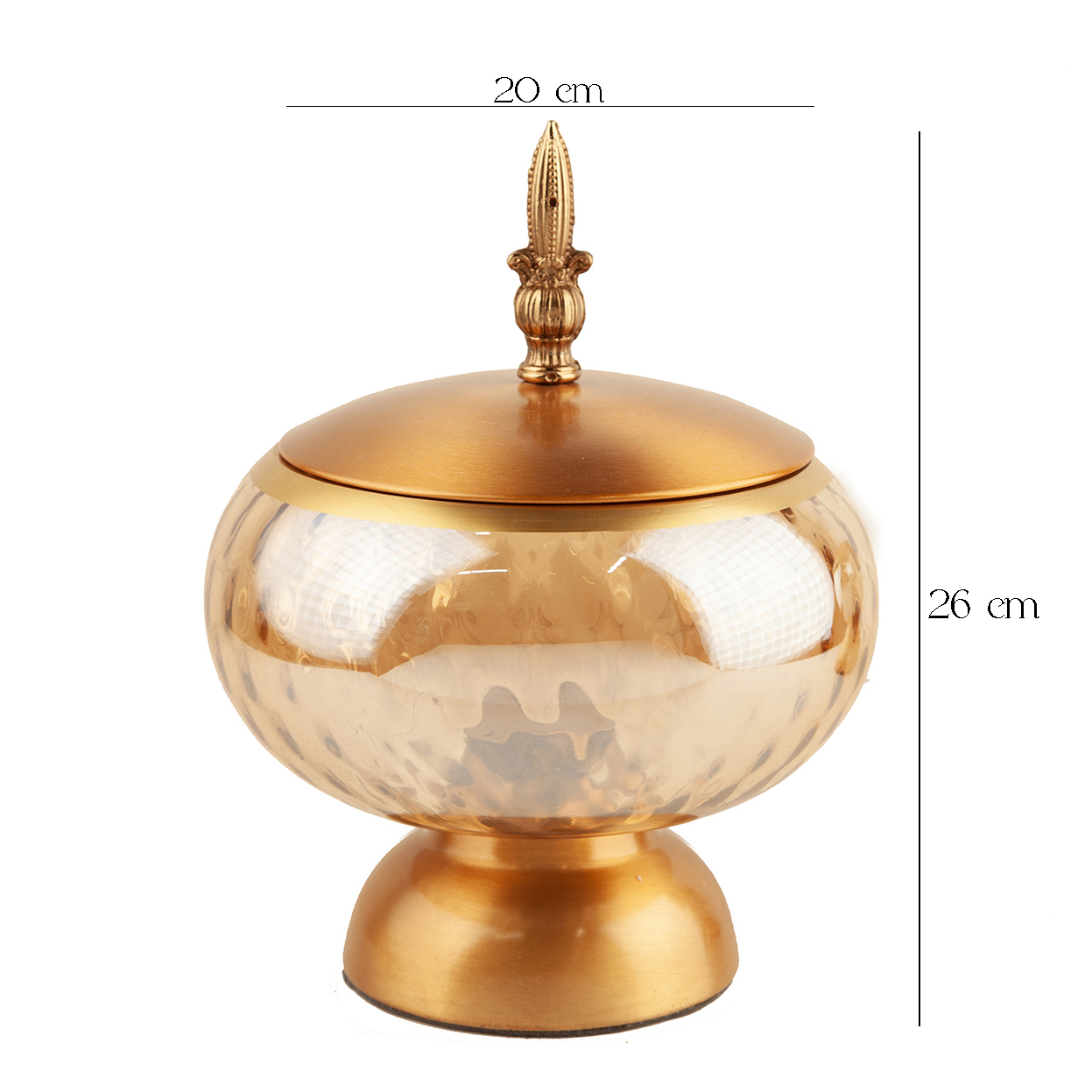 شکلاتخوری دکوری الیا ساختهشده از بلور طرحدار عسلی با لبه طلایی و پایه فلزی آبکاریشده فورتیک؛ عرضهشده در دو سایز مختلف برای پذیرایی یا تزئین لوکس و زیبا.