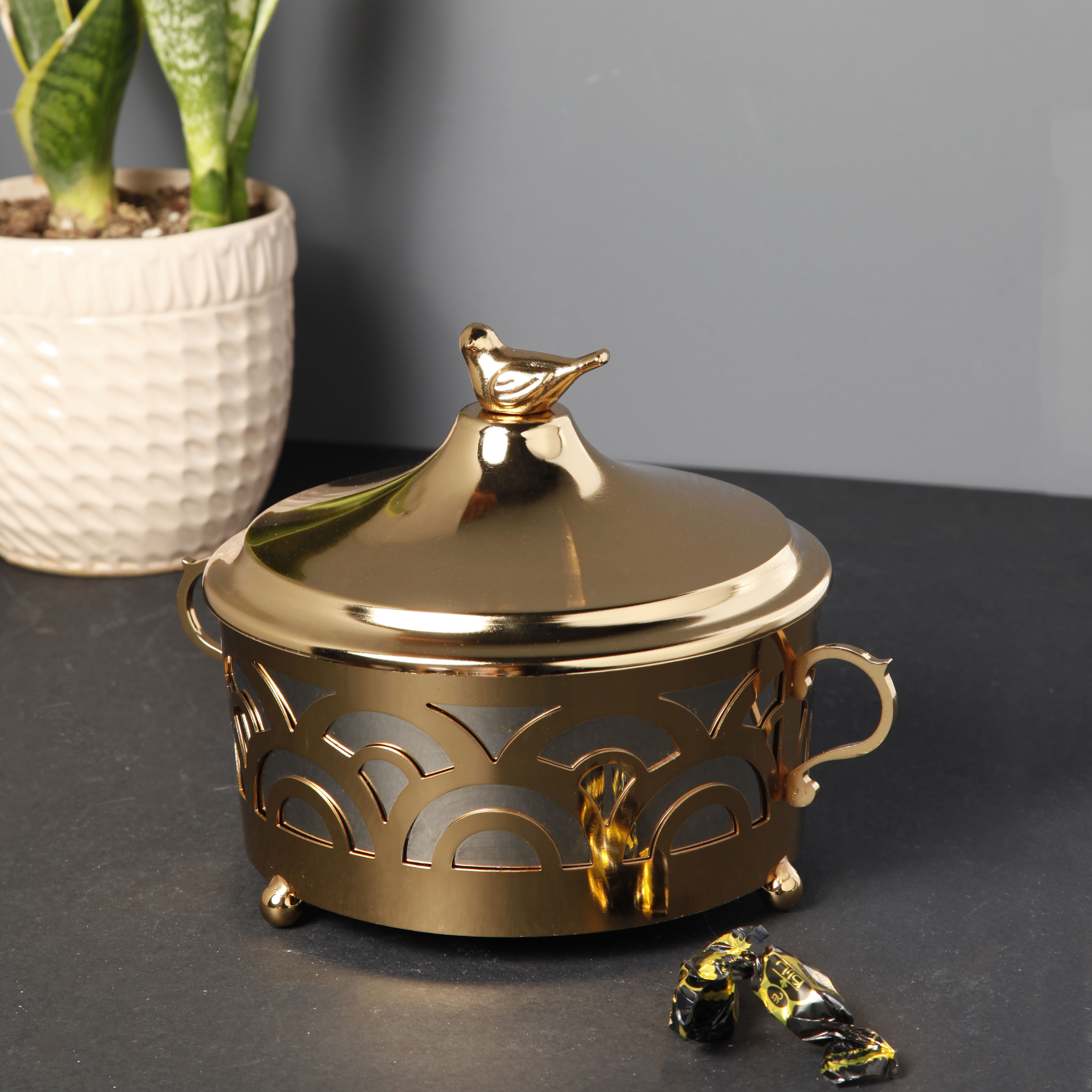 شکلاتخوری فلزی دستهدار طرح پرده ای بزرگ برنز آسا با طراحی لوکس و بدنه آبکاریشده، انتخابی شیک برای سرو شکلات و تنقلات در پذیراییهای خاص.