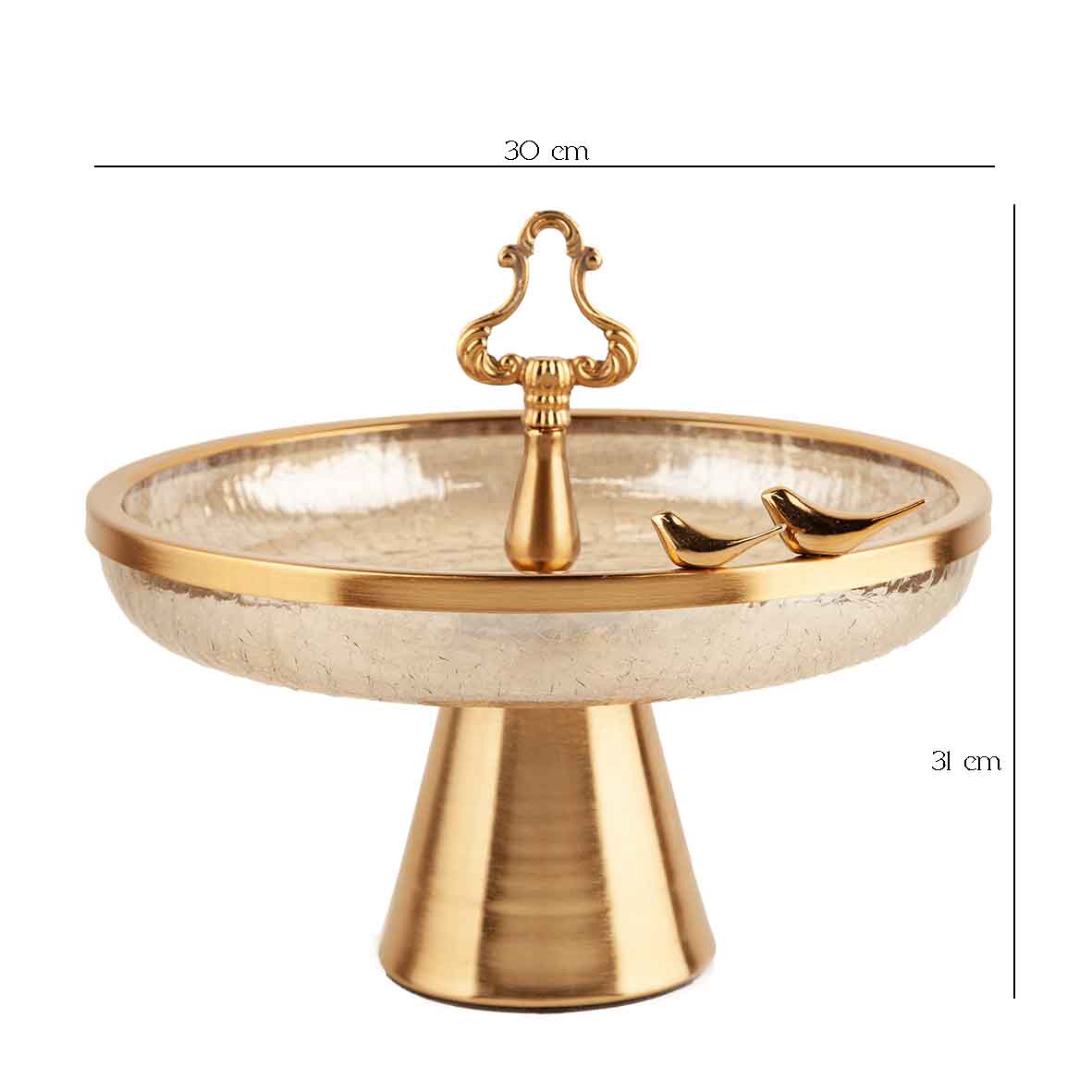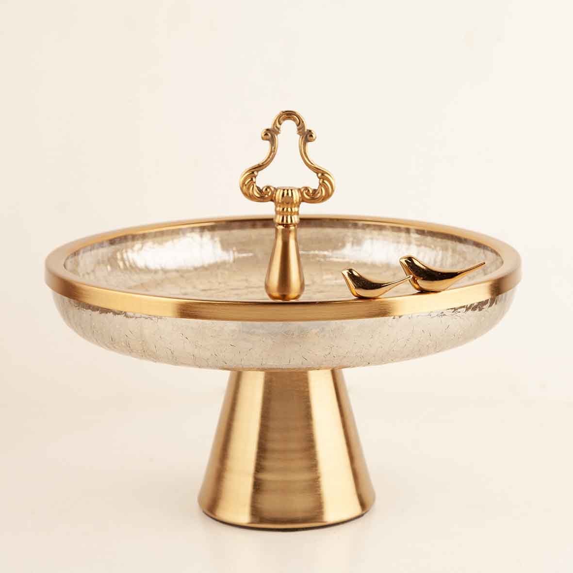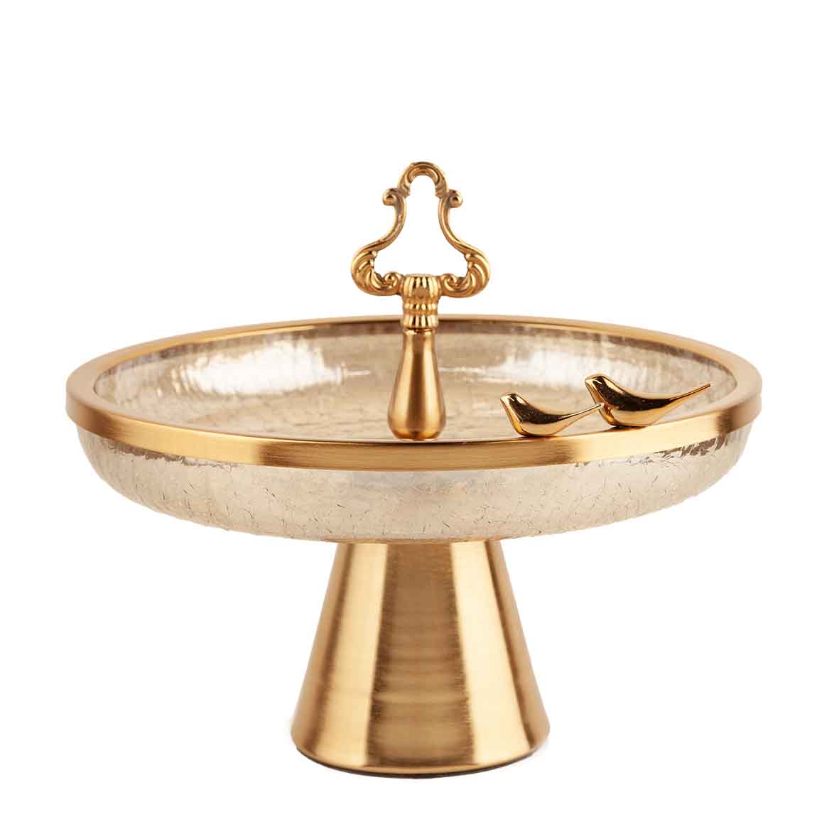 شیرینیخوری دستهدار آبگز از بلور شفاف با طراحی خاص و دسته فلزی آبکاری شده فورتیک، مقاوم در برابر تغییر رنگ و مناسب برای پذیرایی شیک و خاص.