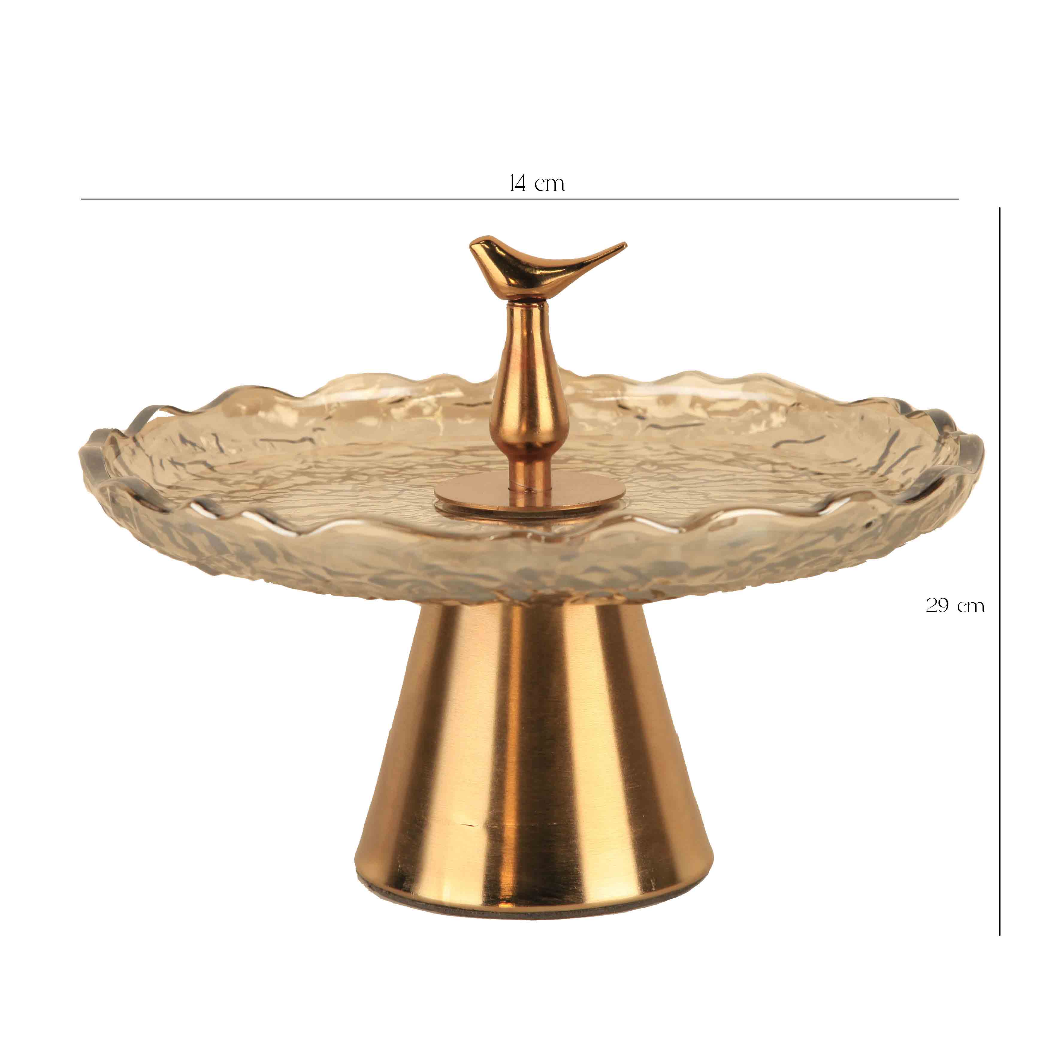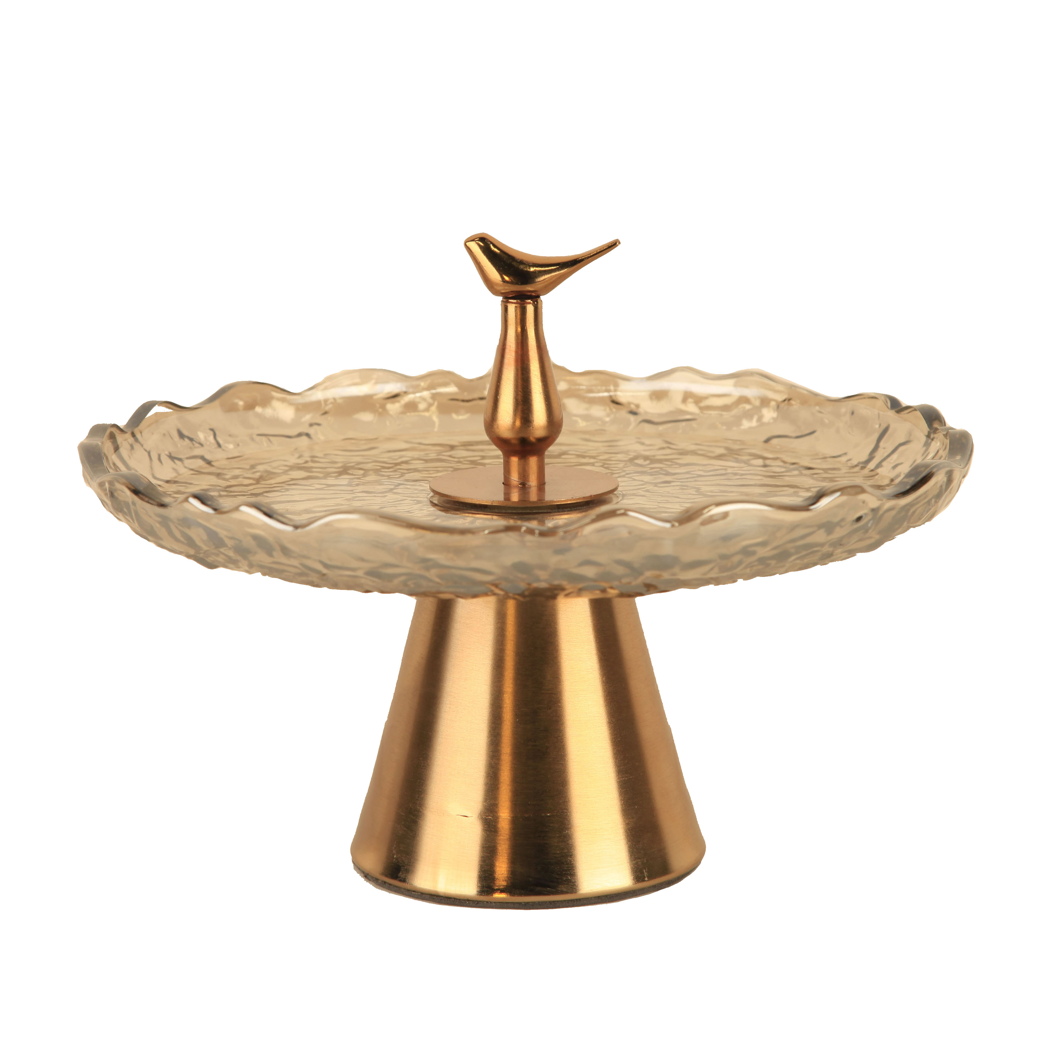 دستهی این شیرینیخوری، از فلز با آبکاری فورتیک طلایی ساخته شده که درخشش خاصی دارد و امکان جابجایی آسان ظرف بدون تماس مستقیم با سطح شیرینیخوری را فراهم میکند. پایه و دسته طلایی رنگ آن، حس لوکس و کلاسیکی به محصول میدهد که با طراحی بلور یخی، تضادی جذاب و چشمنواز ایجاد میکند.
