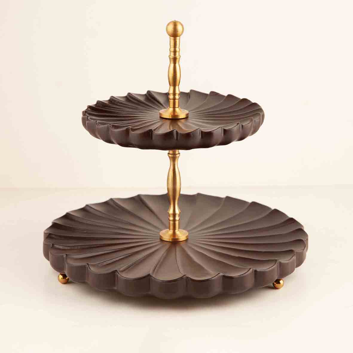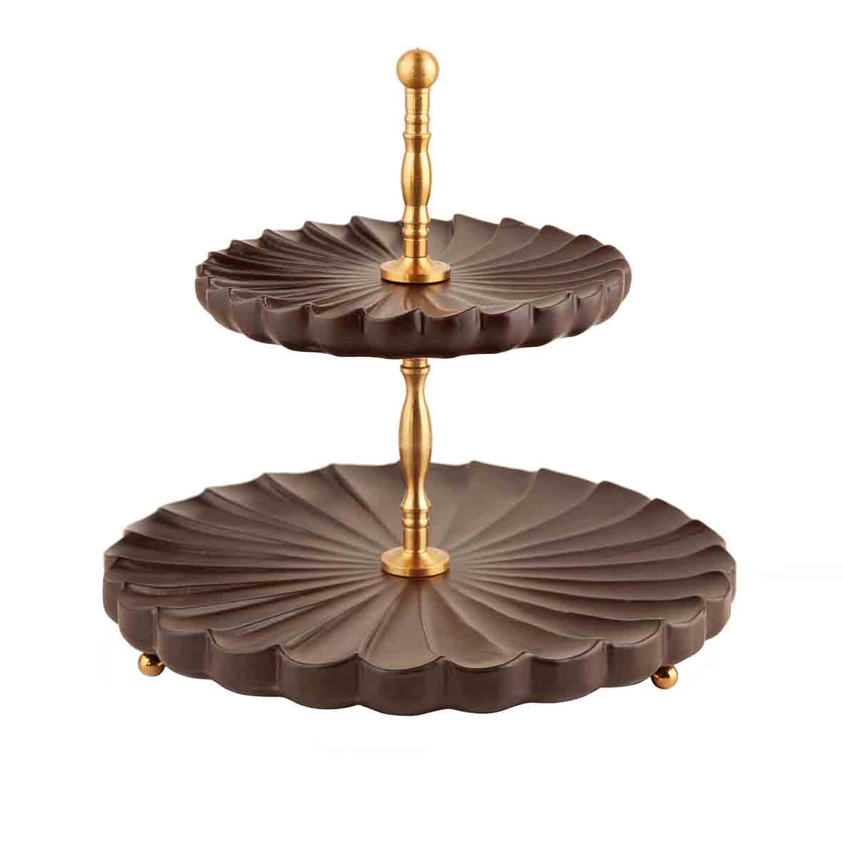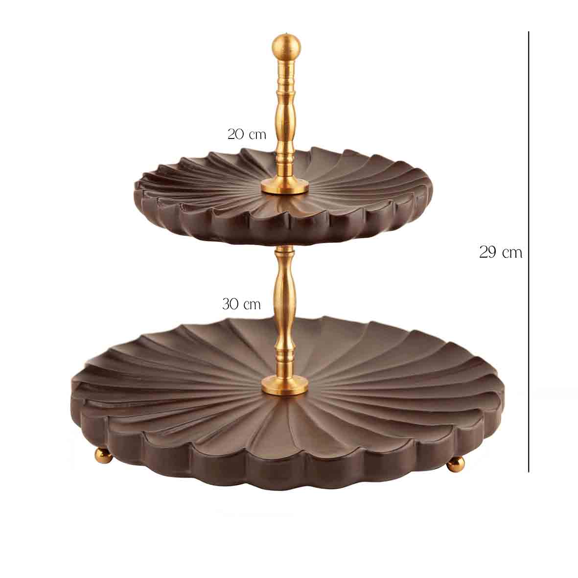 شیرینیخوری دو طبقه ماهور ساختهشده از چوب راش طبیعی با پایهی آلومینیومی آبکاریشده؛ عرضهشده در دو سایز متفاوت برای سرو شیرینی و دسر به شکلی شیک و لوکس.