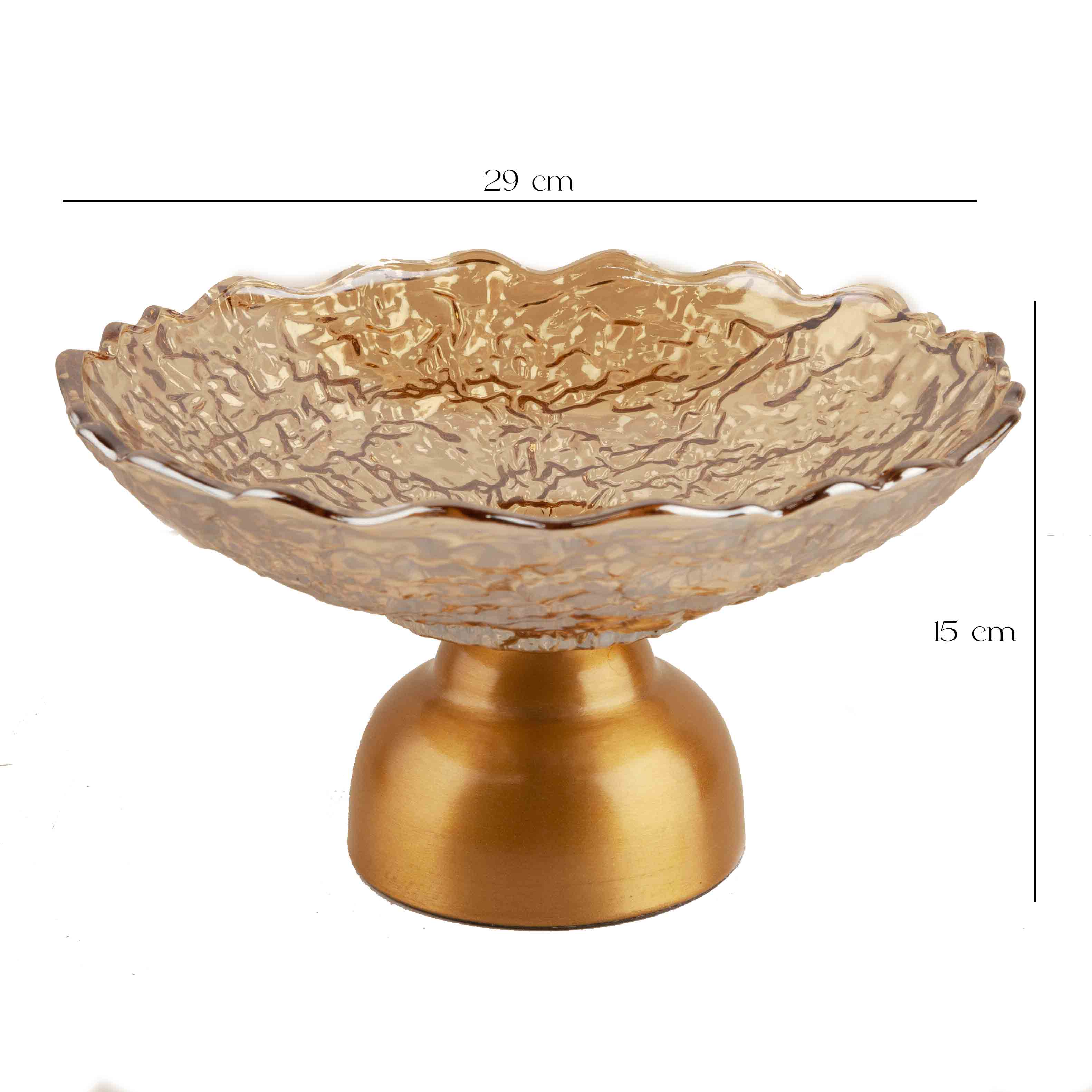 میوهخوری نیمه گود لاوین، ساختهشده از بلور طرح یخی با رنگ عسلی و پایههای فلزی با آبکاری فورتیک. مقاوم در برابر آب و تغییر رنگ، مناسب برای سرو میوه و دسرهای مختلف با طراحی زیبا و کار