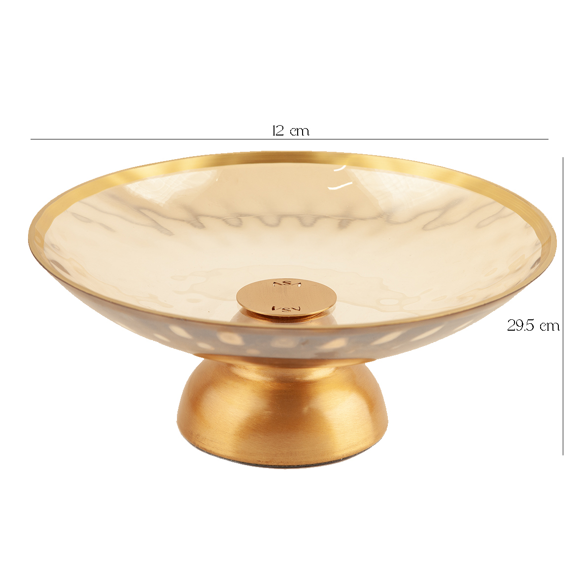 میوهخوری نیمگود الیا ساختهشده از بلور طرحدار عسلی با لبههای طلایی و پایه فلزی آبکاریشده فورتیک؛ ترکیبی از درخشش، ظرافت و زیبایی طبیعی برای دکور یا پذیرایی شیک.