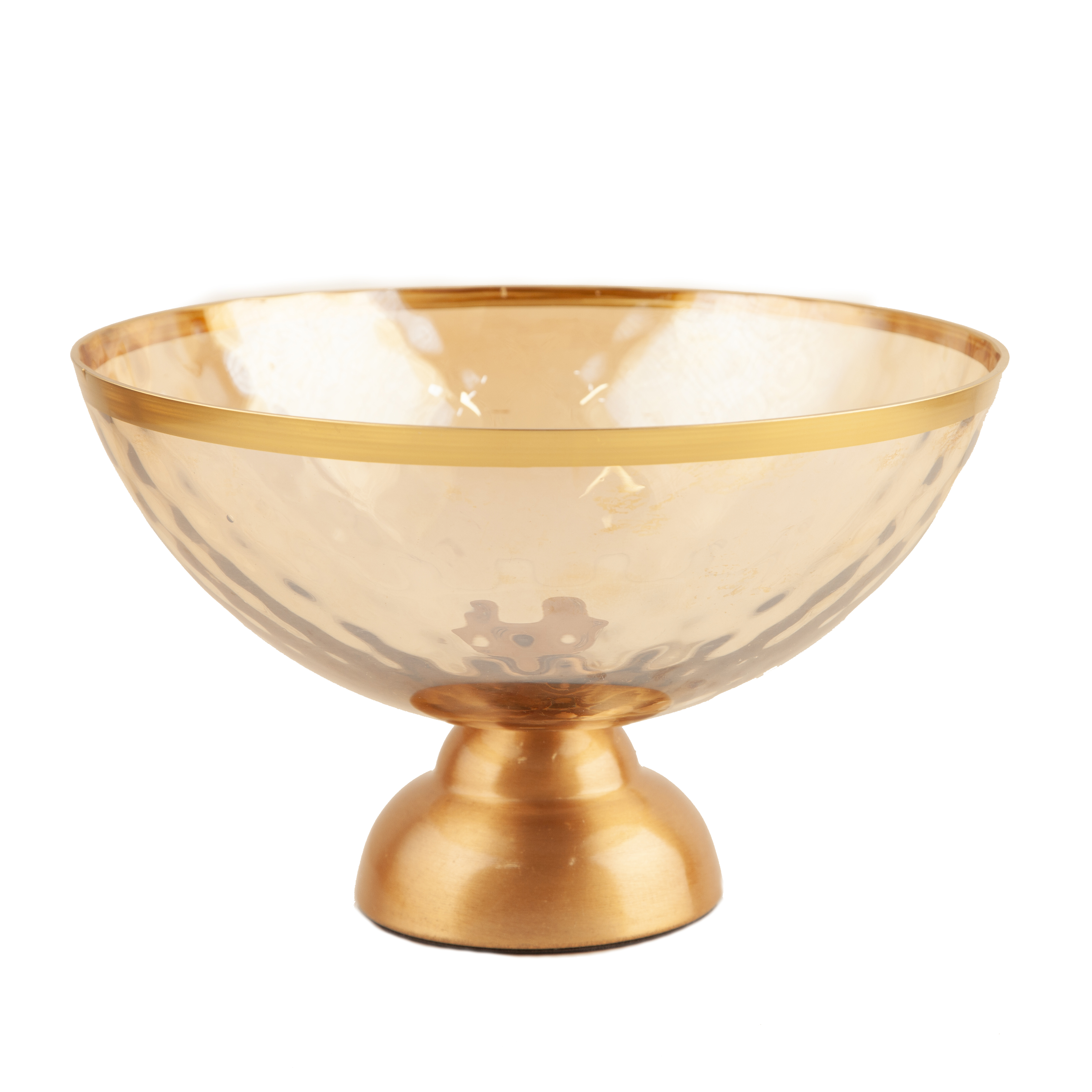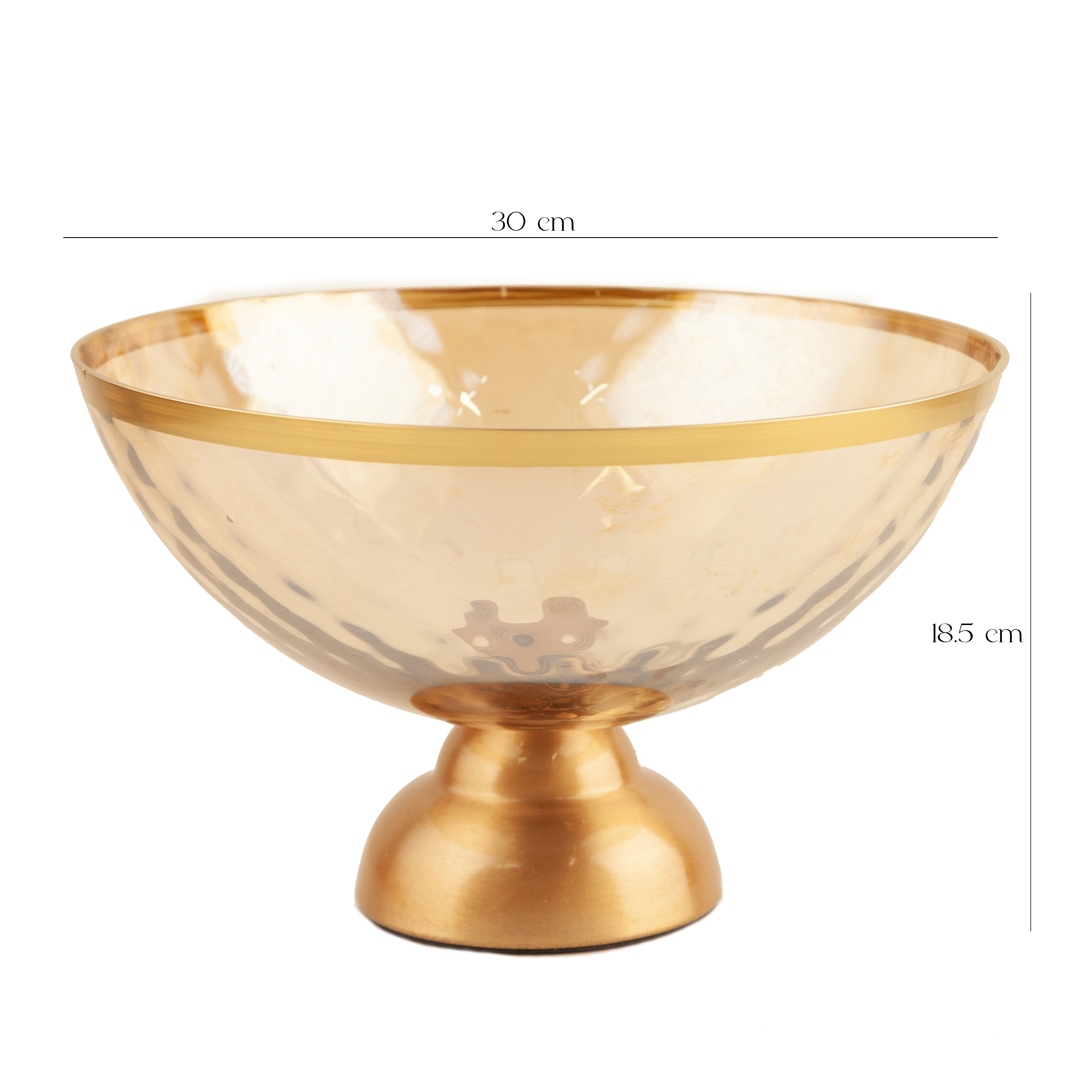 میوهخوری گود الیا ساختهشده از بلور طرحدار عسلی با لبه طلایی و پایه فلزی آبکاریشده فورتیک؛ ترکیبی از ظرافت، درخشش و هنر مدرن برای پذیرایی یا تزئین لوکس.