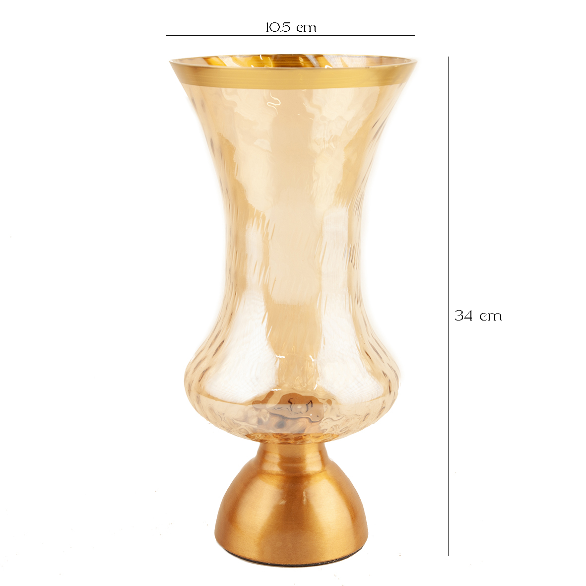 گلدان دکوری الیا ساختهشده از بلور طرحدار عسلی با لبههای طلایی و پایه فلزی آبکاریشده فورتیک؛ ترکیبی دلفریب از ظرافت، درخشش و زیبایی هنری برای هر دکوراسیون.
